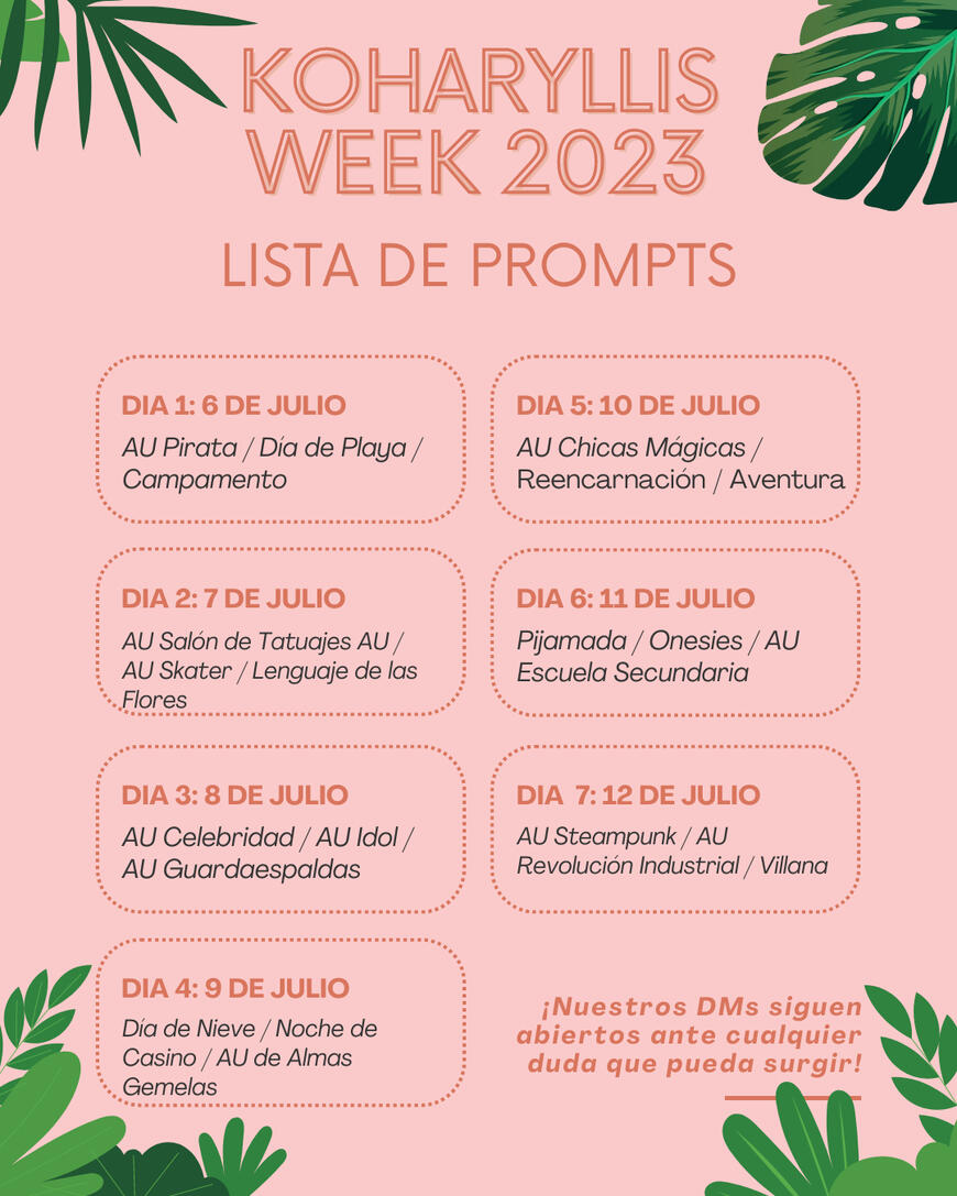 Las prompts son principalmente una fuente de inspiración, puedes usar una, combinar dos o más, o no usar ninguna 😊 – ¡será bienvenido siempre y cuando sea relacionado a Koharyllis!
